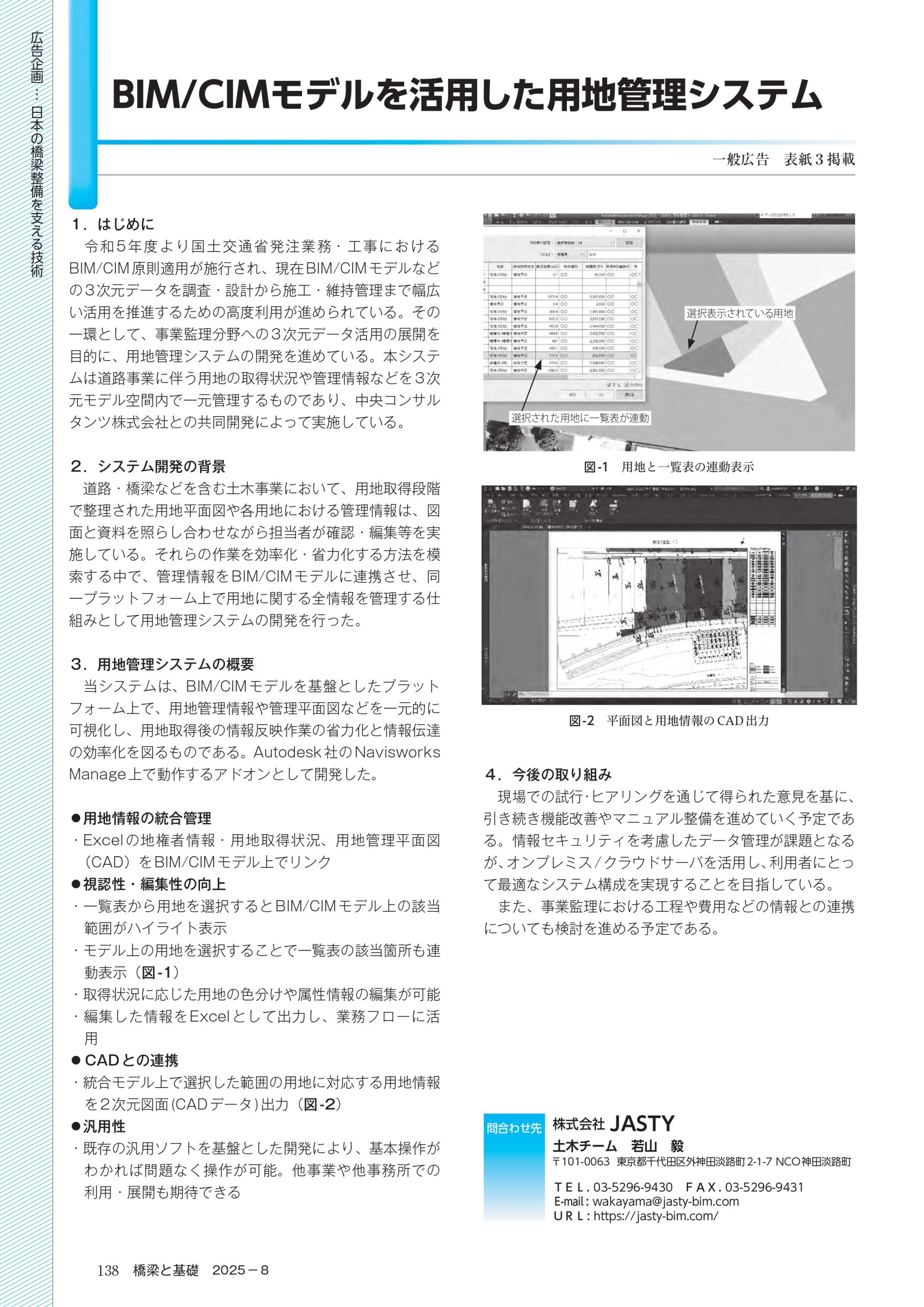 また、本誌の技術紹介企画では、グループ会社 JASTY が 中央コンサルタンツ と共同開発を進めている、「BIM/CIMモデルを活用した用地管理システム」 の取り組みについてもご紹介いただいております。